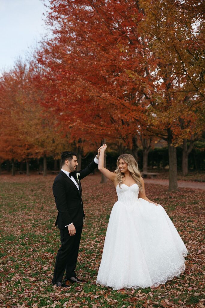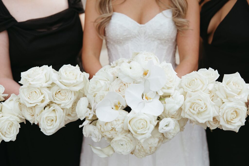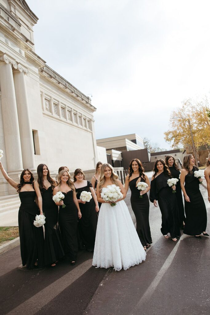 Fashion played a big role in the overall look and feel of the day. Hannah wore a stunning, intricately detailed gown that allowed her to move freely and stay present throughout every moment. No heavy train, no fuss—just elegance and ease. Dylan and the groomsmen wore classic black tuxes, while the bridesmaids matched in sleek black dresses, creating a cohesive and timeless aesthetic.