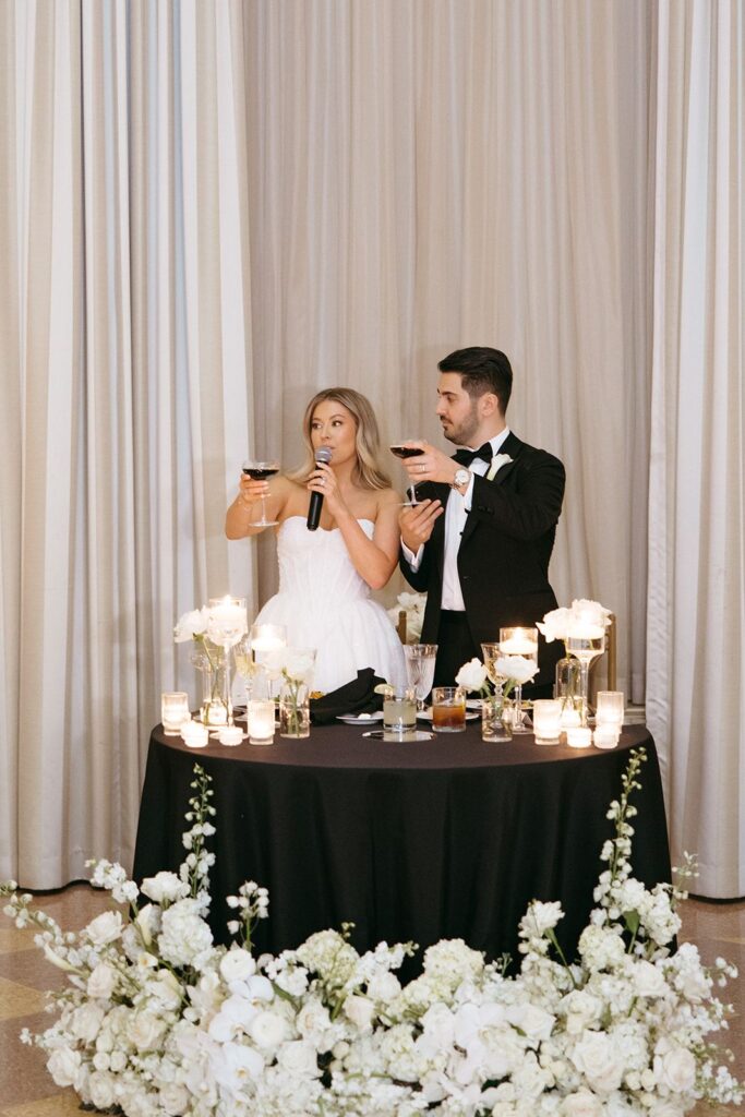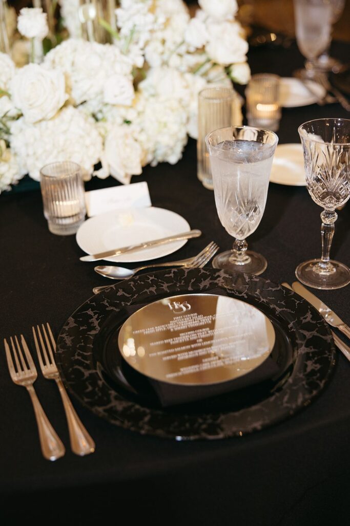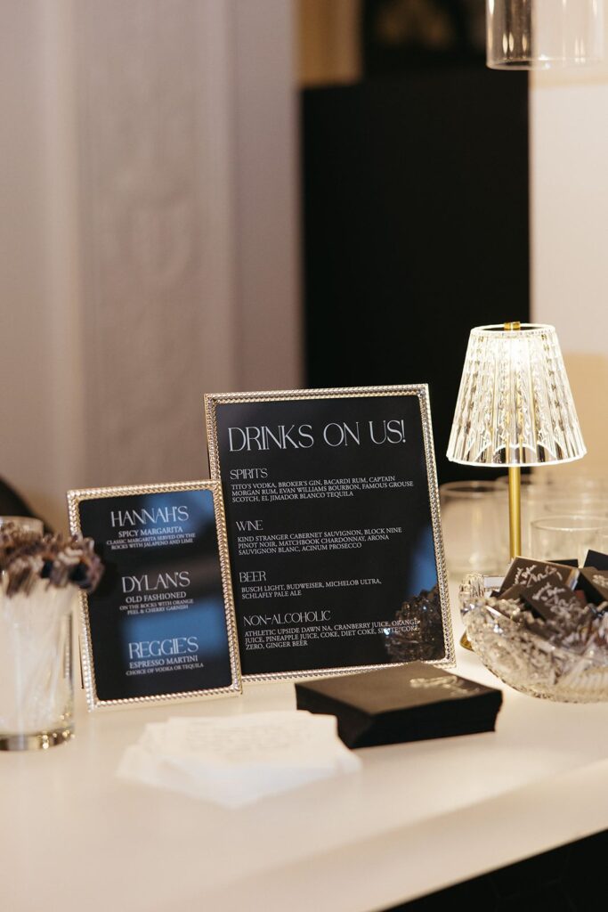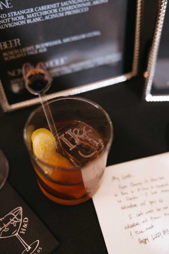Personal touches were everywhere. Their dog, Reggie, made an appearance on drink stirrers, cocktail napkins, and matchbooks—bringing smiles all around. Mirror menus at each place setting added another layer of elegance and reflected the candlelight beautifully.